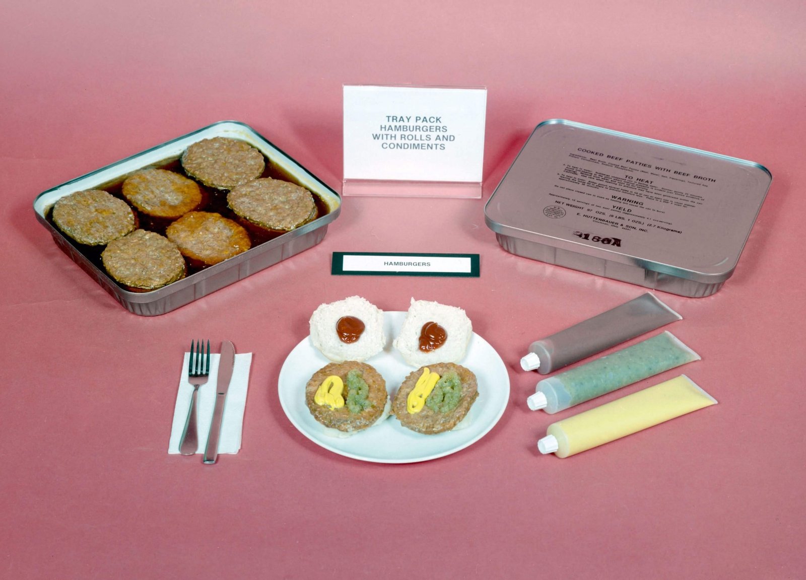 Tray pack, hamburgers with rolls and condiments, 1988