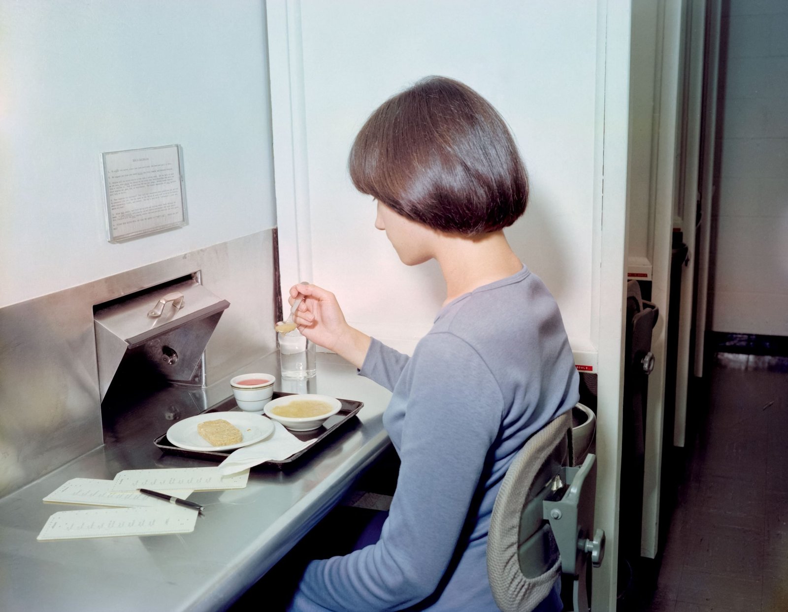 Food taste kitchen, taste test, volunteer sampling food, 1977