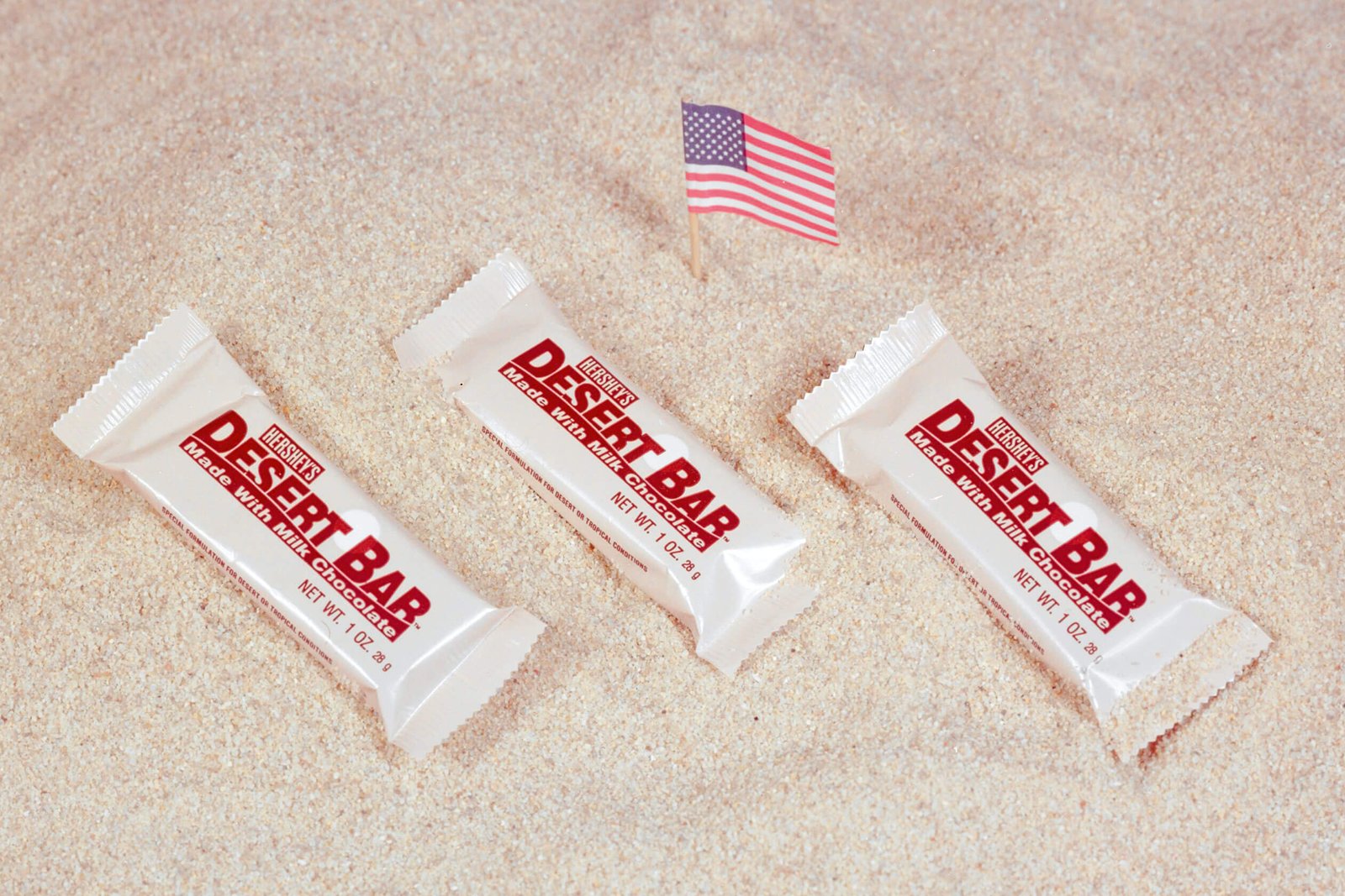 Desert Shield, candy bar on sand with flag, 1991