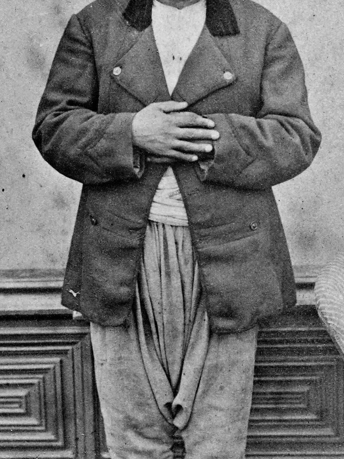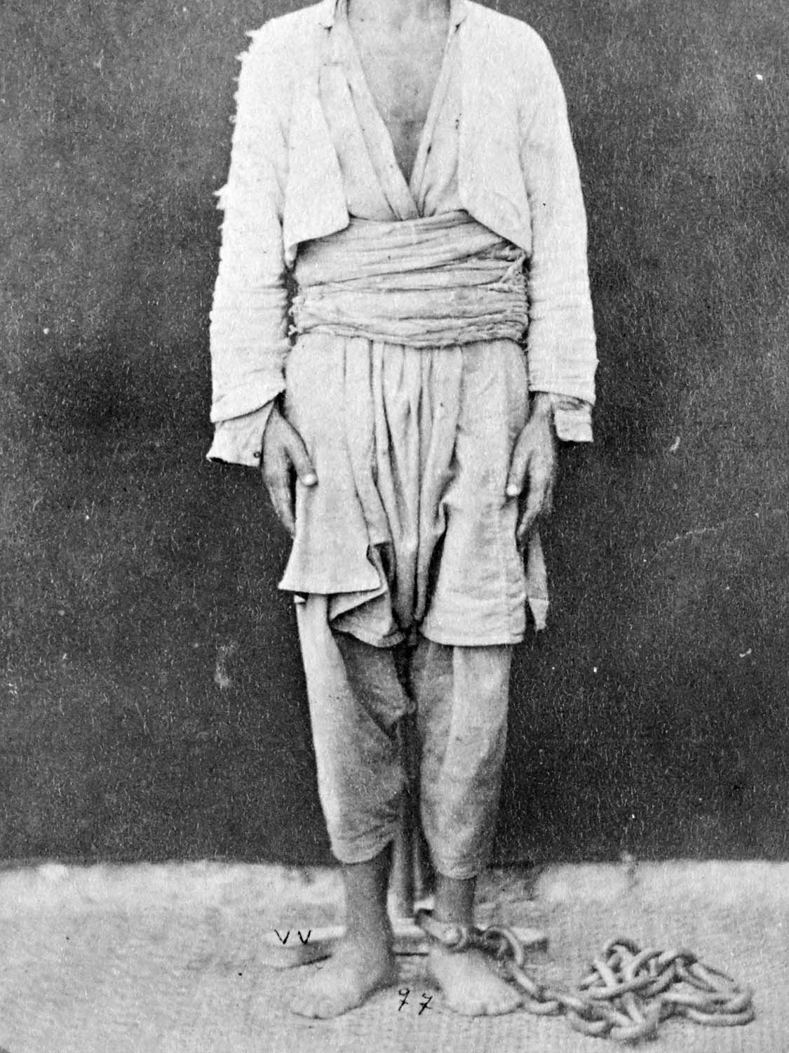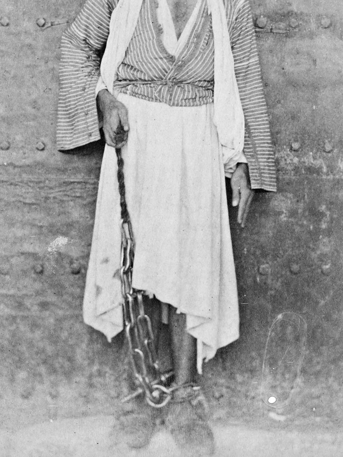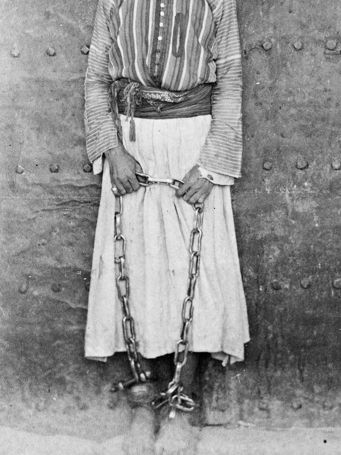 Among Abdulhamid’s many interests were crime fiction novels. Abdulhamid II during the 25th year of his reign, ordered all murder convicts in the country to be photographed with their hands showing, in preparation for a planned amnesty. He has been moved by pseudo-scientific information he had read in a crime novel that “any criminal with a thumb joint longer than the index finger joint, is inclined to murder.” To this end, the photographs in the first wall (Hayal) show the subjects’ hands for the purpose of classification. Whereas in the second wall (Hakikat), we see chained prisoners who are all sentenced to death —having nothing to do with the amnesty in question.