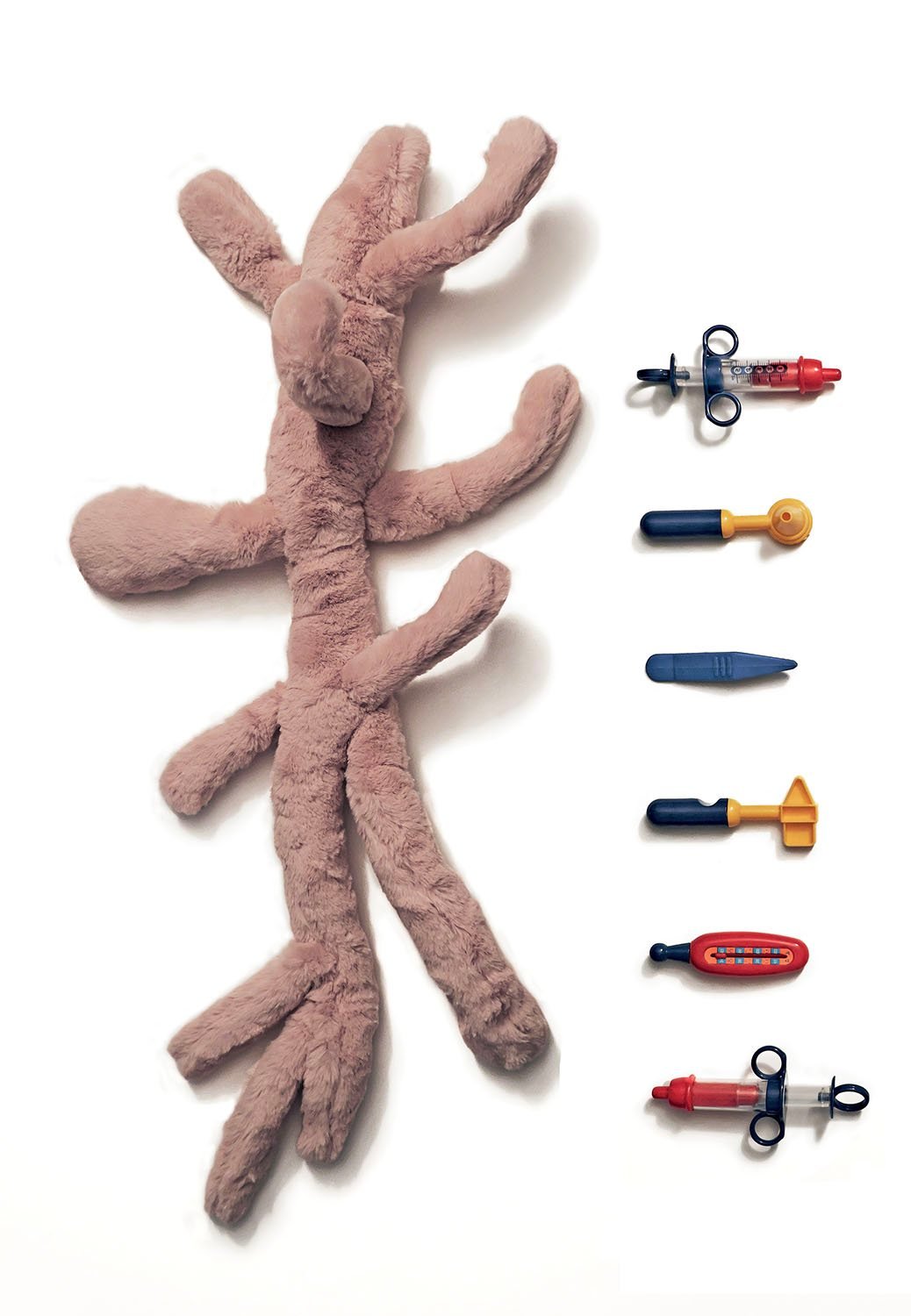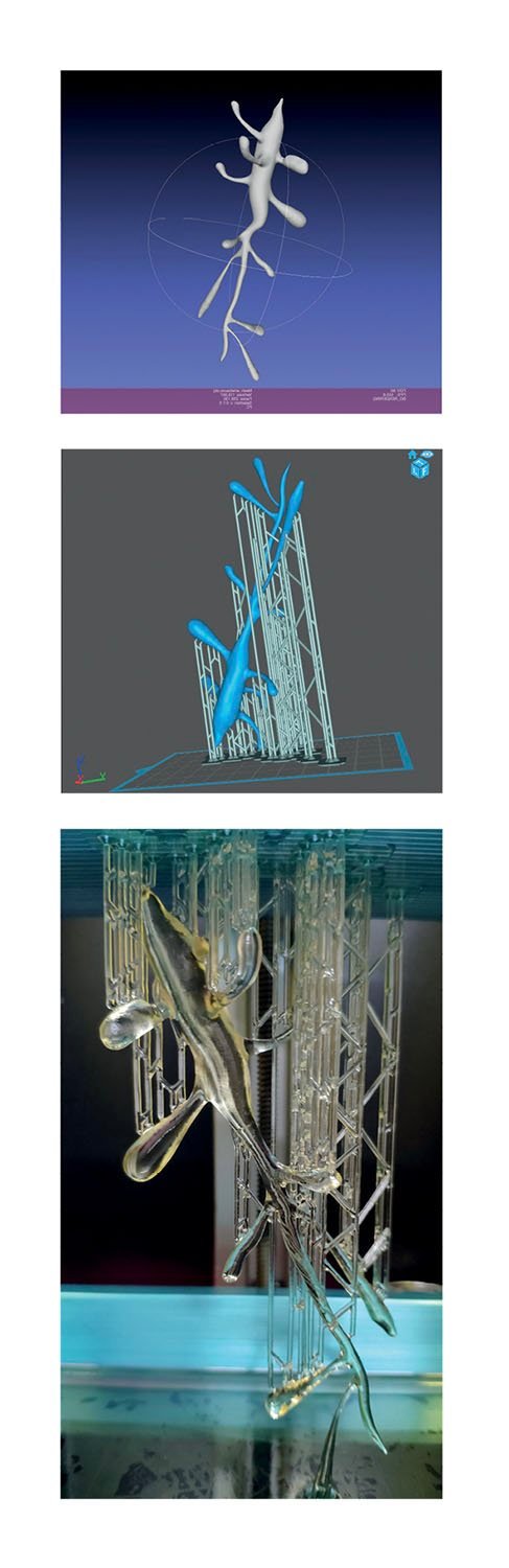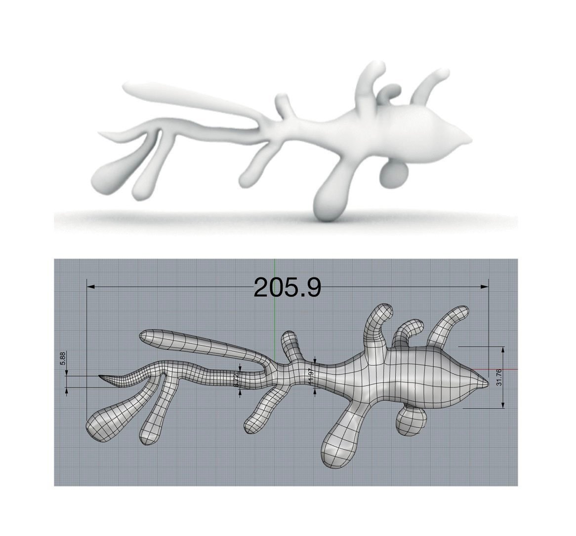 From the tracing drawings of the initial photograph, first a small zoo of biomorphic figures emerged, traced in ink on a glossy surface, then a three-dimensional rendering of one of these figures, from which two sculptures were produced: a 15 cm resin sculpture with DLP photopolymer printing and an inflatable one in satin-finish PVC about 3 meters long. From the initial photograph were also produced little interactive installations with stones, nails and elastic bands, a plush sculpture, a UV ink stamp, a heraldic coat of arms on an original model of 1600, a pillow, zodiac cards with new constellations and other objects.