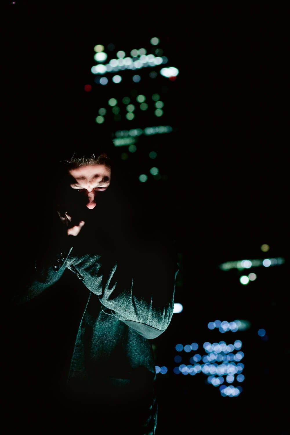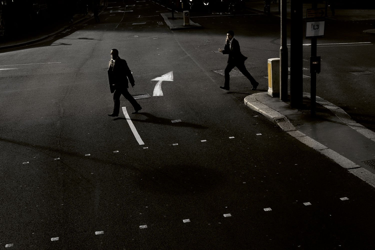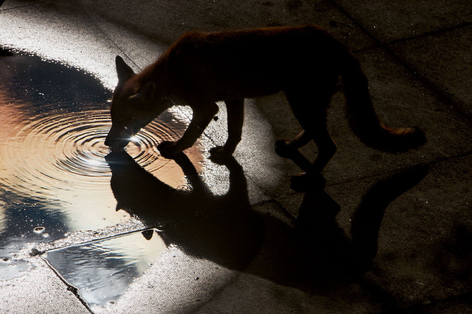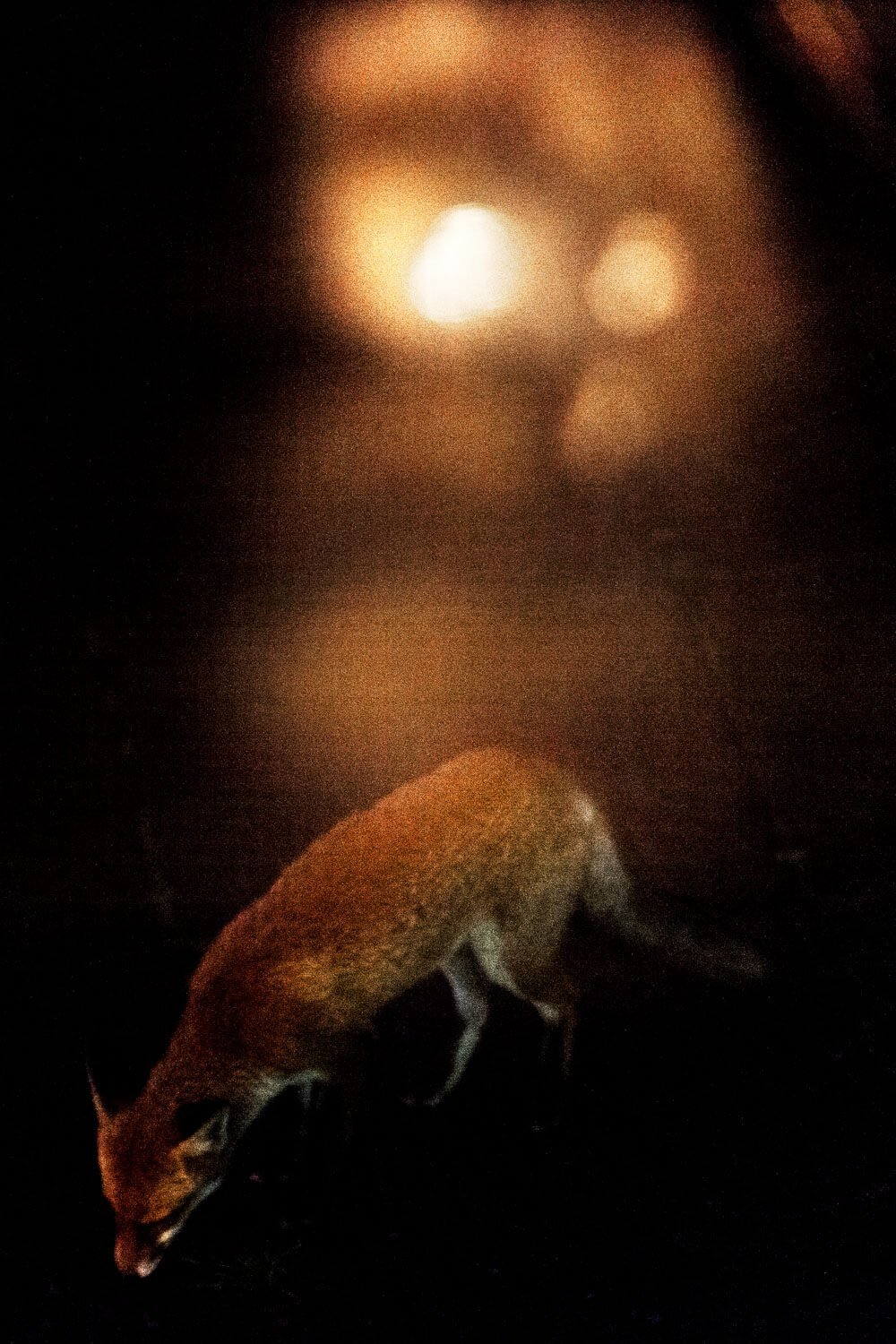 To make this project, Alba would begin photographing in the hours when both the city brokers left their offices and the foxes came out onto the streets. Echoing the methodology of a wildlife photographer, Alba studied the behavior of his subjects and waited patiently for both humans and foxes to appear. The resulting photographs show the fleeting movement of both the foxes and city workers through the same streets. The backdrops show both austere, slick office buildings and also areas where nature is slowly encroaching on the city. Mainly lit by artificial street and office lights, both people and beast are often obscured by darkness and shadow.