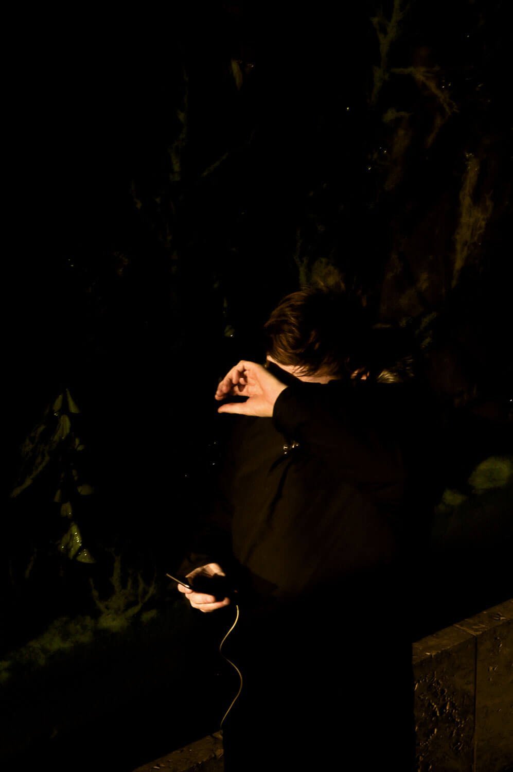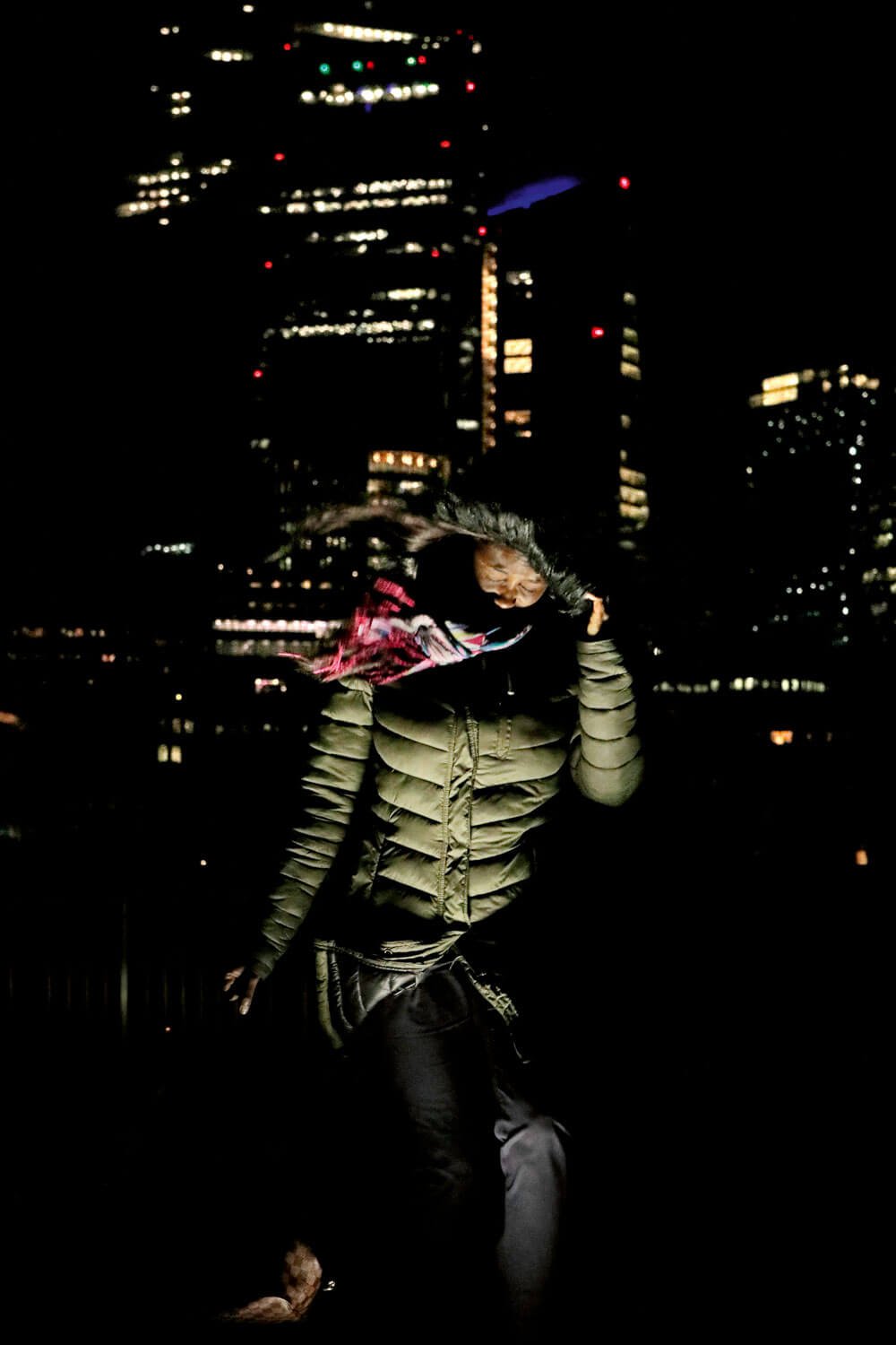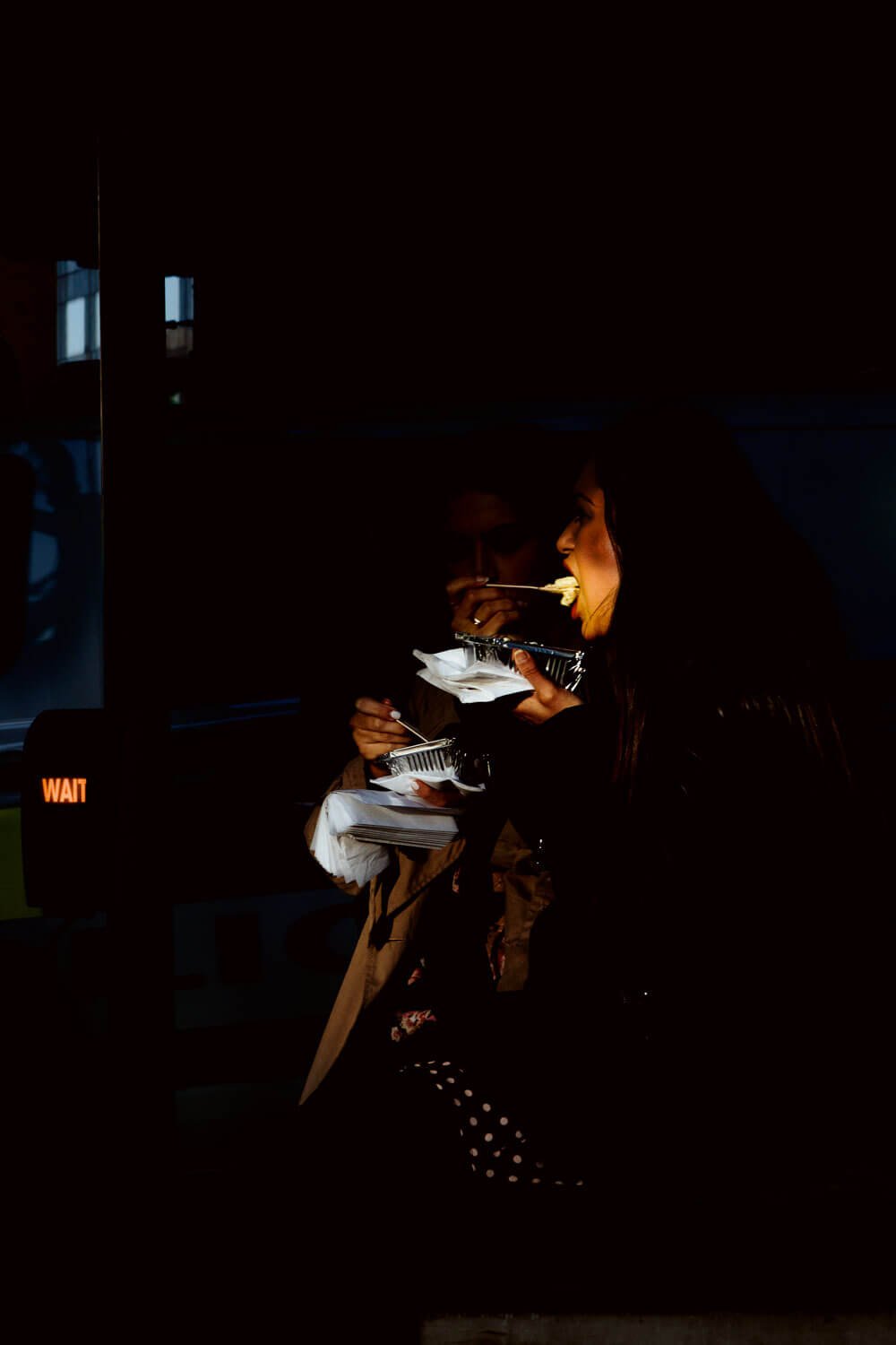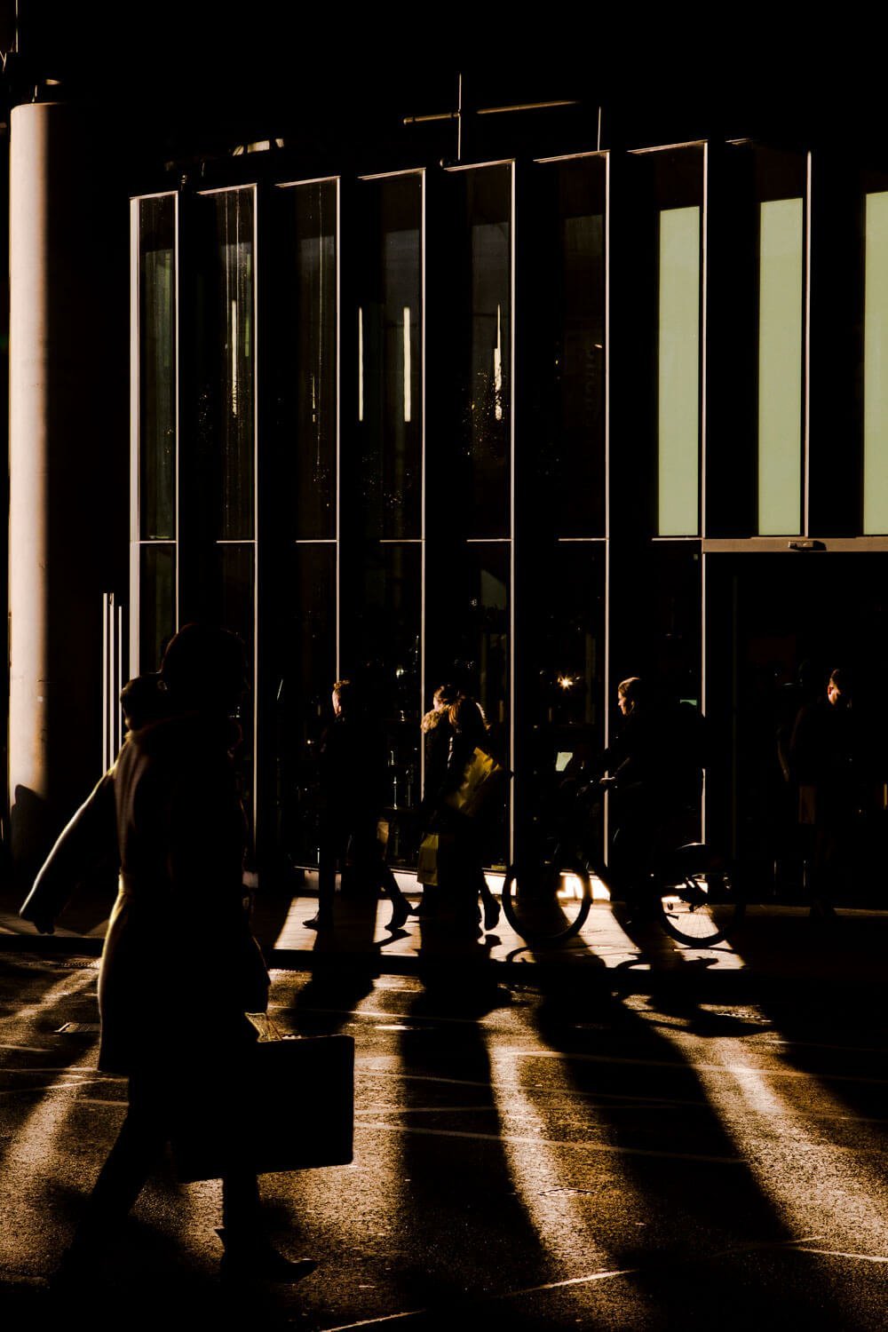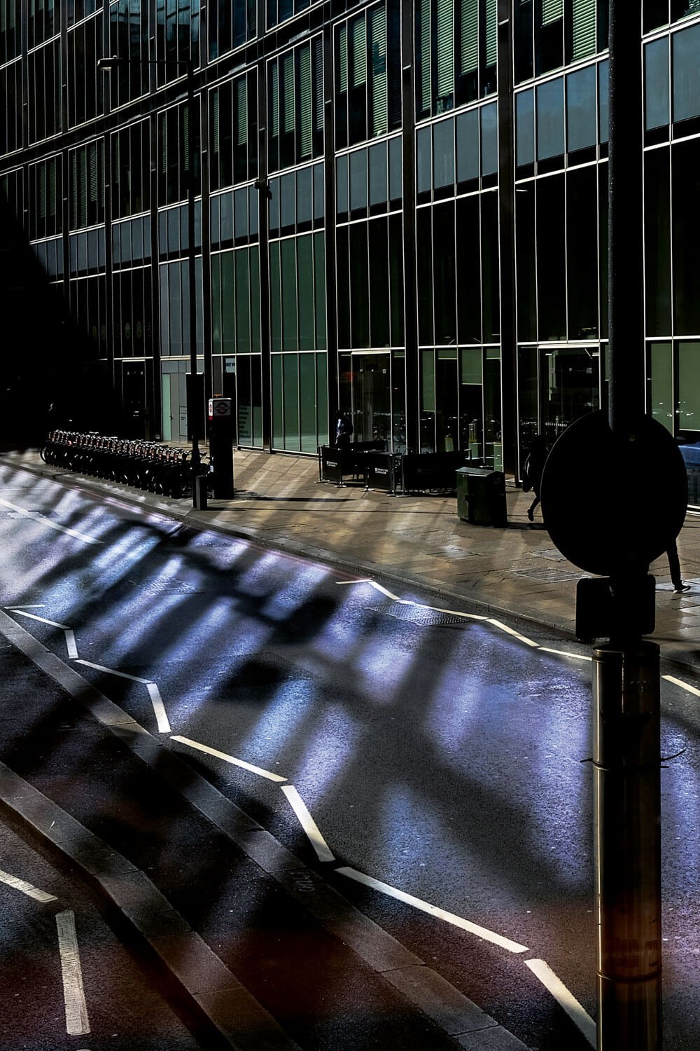 To make this project, Alba would begin photographing in the hours when both the city brokers left their offices and the foxes came out onto the streets. Echoing the methodology of a wildlife photographer, Alba studied the behavior of his subjects and waited patiently for both humans and foxes to appear. The resulting photographs show the fleeting movement of both the foxes and city workers through the same streets. The backdrops show both austere, slick office buildings and also areas where nature is slowly encroaching on the city. Mainly lit by artificial street and office lights, both people and beast are often obscured by darkness and shadow.