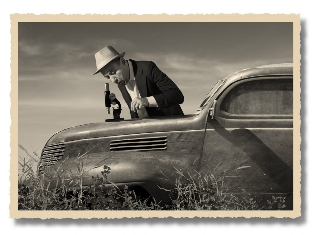 What he needed for the pictures was a rough surface, ideally grey and full of craters. And where better to find all this than on the rusty varnish of his old Dodge behind the shed of Freddy’s barber shop? Up close, the varnish looked exactly like the famous lunar craters. With his old school microscope, Stanley made hundreds of “Moon photos” which served as ideal image stock for the NASA cartography team.