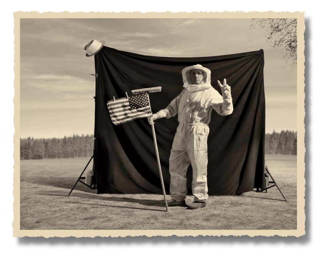 Stanley’s biggest problem was getting hold of an authentic-looking space suit – an old beekeeper’s overall finally did the trick. This scene was photographed at a children’s playground. Stanley successfully got rid of unwanted onlookers by telling them he was after the “killer bees”.