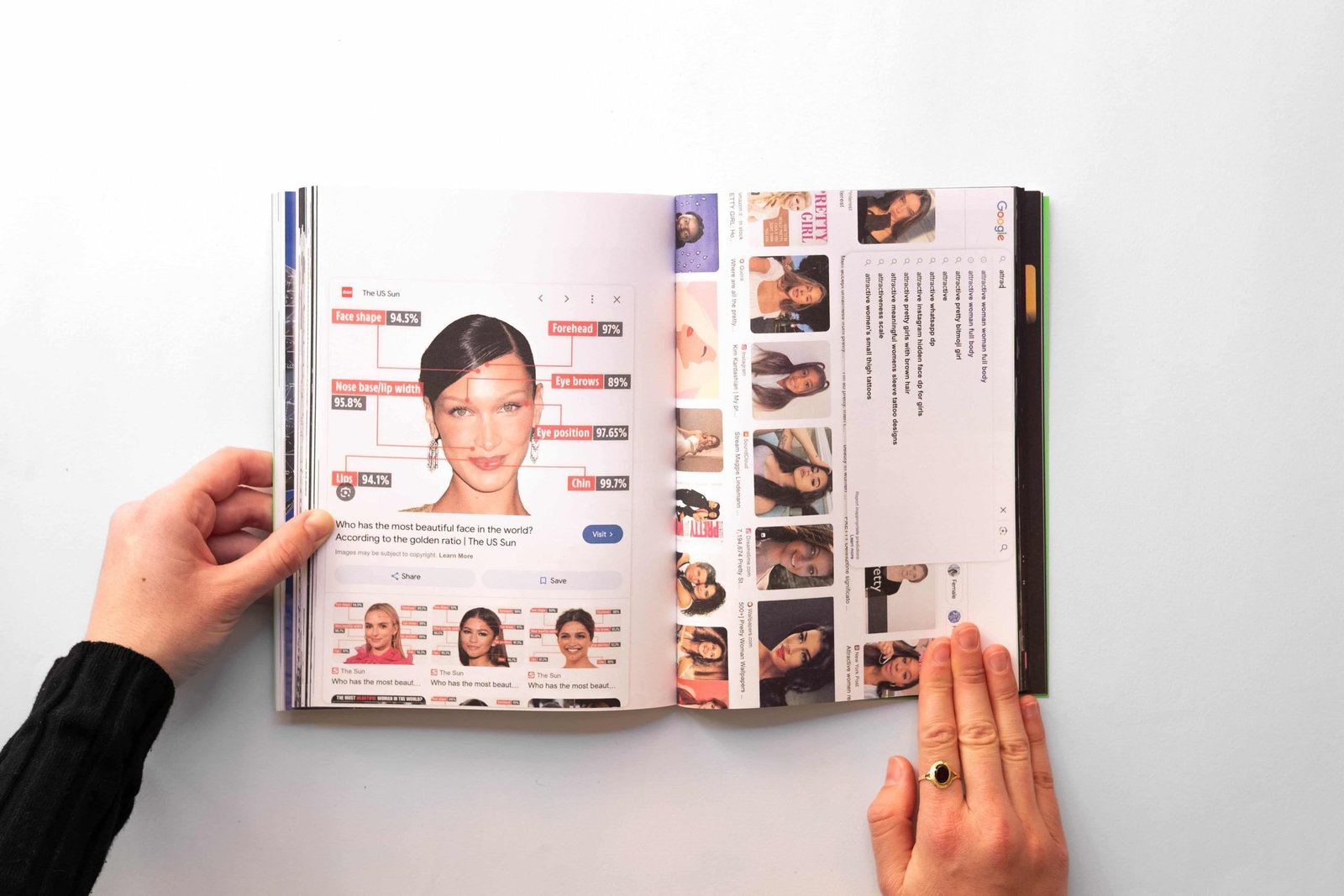 The artist plays with the media, experiments on herself, and exposes the mechanisms of the web, confronting platforms and algorithms that perpetuate homogenizing aesthetic standards.