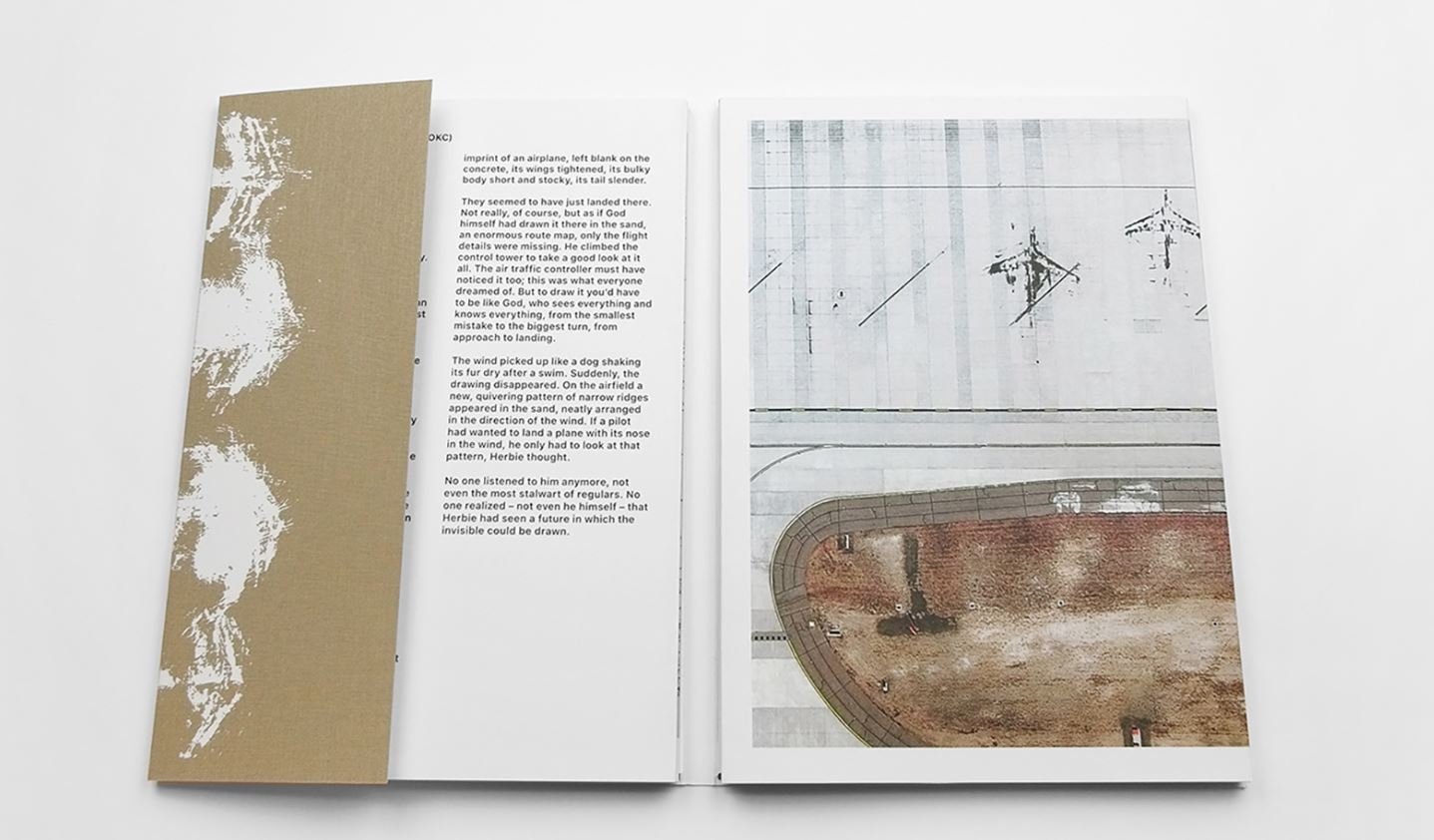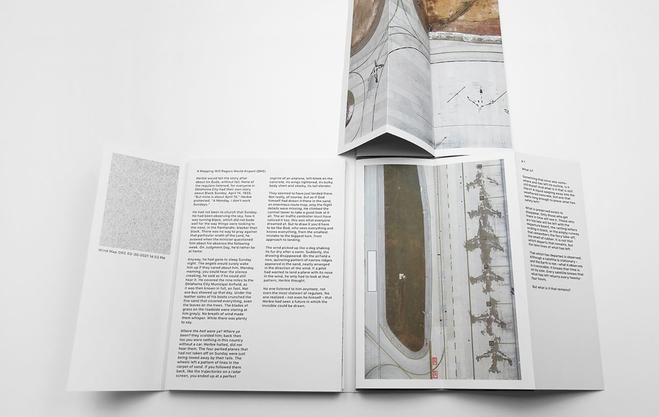 Footprint is exploring ways of mapping information and aerial and satellite photography of the landscape in general and Will Rogers World Airport (OKC) specifically. As an artist, Gerco de Ruijter started out looking at landscapes from the perspective of a kite. From above, the world he photographed usually looked like an abstract map. About ten years ago, he shifted his interest to Google Earth. The satellite images seemed to be made by a kite from outer space. Together with writer and filmmaker Peter Delpeut they set out on a visual investigation into a phenomenon which they encountered on Google Earth, looking at airports. In the winter, planes are stripped of ice. On the concrete the stencil of an aeroplane remains, just long enough for the satellite to photograph it. De Ruijter and Delpeut wondered whether these giant drawings of aeroplanes really belong on a map. Or is Google Earth not a map, but a unique image of the world? It led to a quest for the mysterious aspects of ‘maps’ and Google Earth in particular, with Oklahoma City airport as the centre of attention.